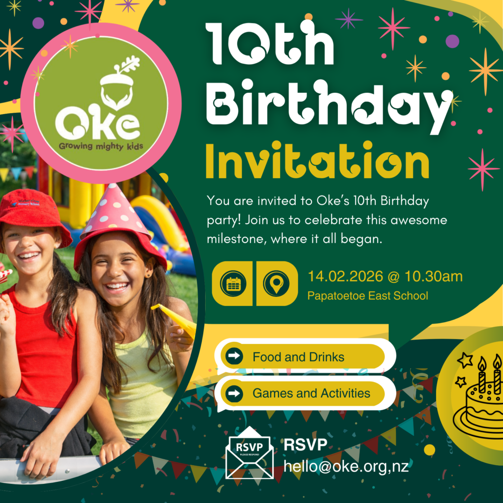 On Saturday 14 February 2026, we’re throwing a proper birthday bash at Papatoetoe East School, right where Oke first got started. Expect kids everywhere, food and drinks, games and activities, a bit of noise, a bit of mess, and a whole lot of smiles. This is our chance to celebrate ten years of outdoor classrooms, community working bees, muddy hands, big laughs, and kids learning in ways that actually work for them. No long speeches. No fancy stuff. Just a good old-fashioned Oke celebration with the people who helped make it happen and a chance to look ahead to the next ten years of growing mighty kids.